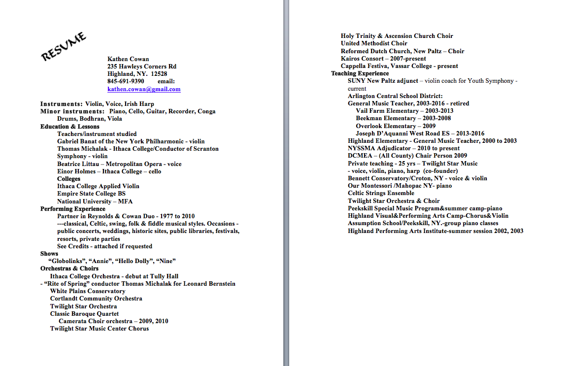 Kathen has performed for 40 years on violin, Irish harp and vocally. Her favorite genre is classical but she has performed fiddle, jazz and ethnic music of all kinds. She has performed in various groups as well, such as La Tipica Antillana, Kairos Consort, Cappella Festiva and as a hired soprano in several church & temple settings. Please visit the Gallery below. For her Resume, click the link below.